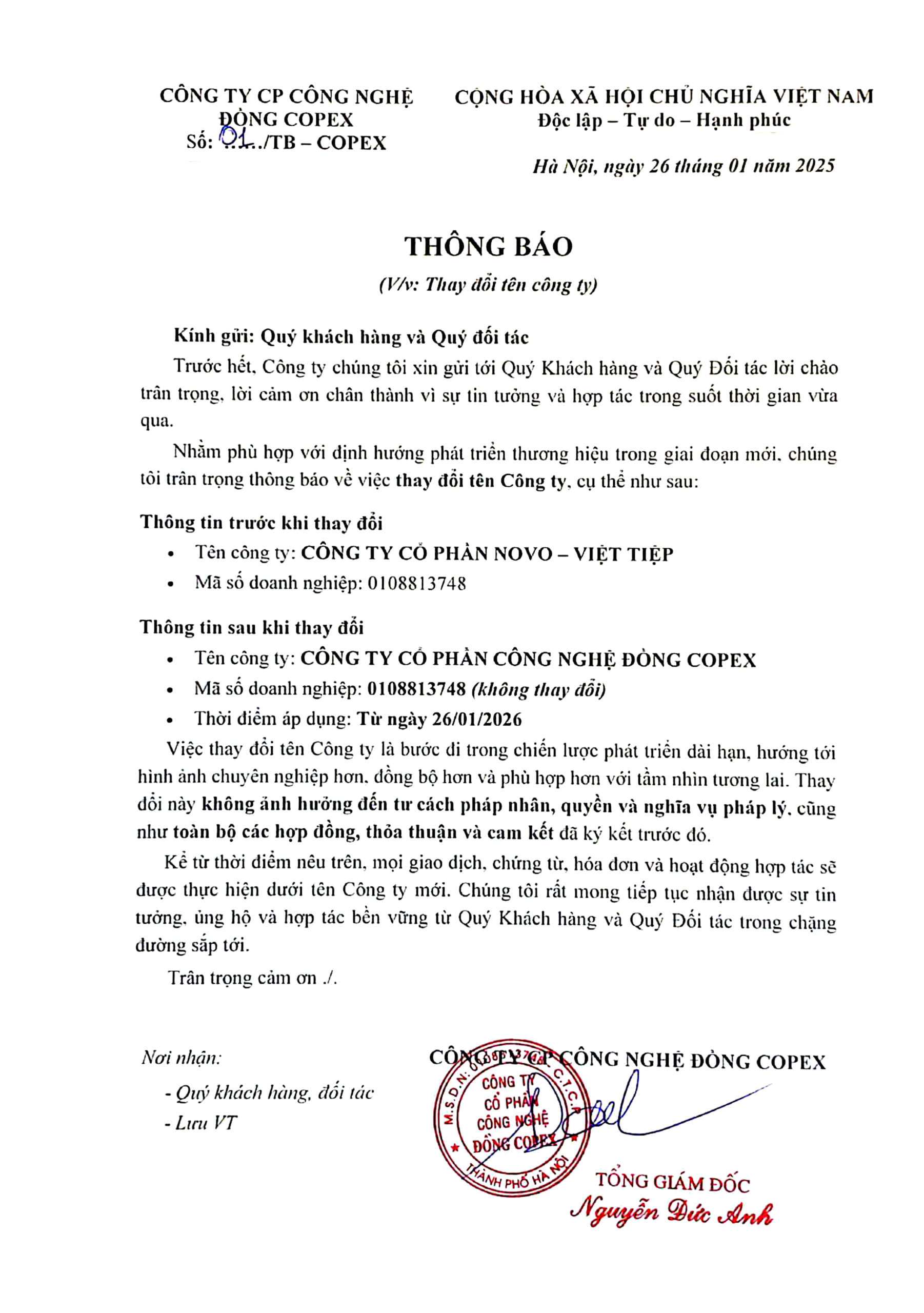 Căn cứ định hướng phát triển và chiến lược thương hiệu trong giai đoạn mới, Công ty Cổ phần Công nghệ đồng Novo-Việt Tiệp trân trọng thông báo tới Quý Khách hàng, Quý Đối tác về việc thay đổi tên công ty, cụ thể như sau: